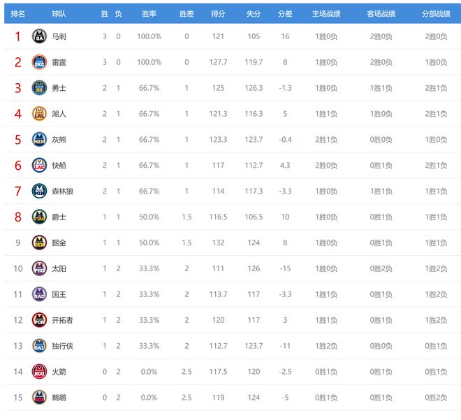 目前西部诸队的战绩情况是:马刺、雷霆开赛不败,都是3胜0负,勇士、湖人、森林狼、灰熊、快船都是2胜1负,爵士、掘金1胜1负,太阳、国王、开拓者、独行侠1胜2负,火箭、鹈鹕0胜2负。